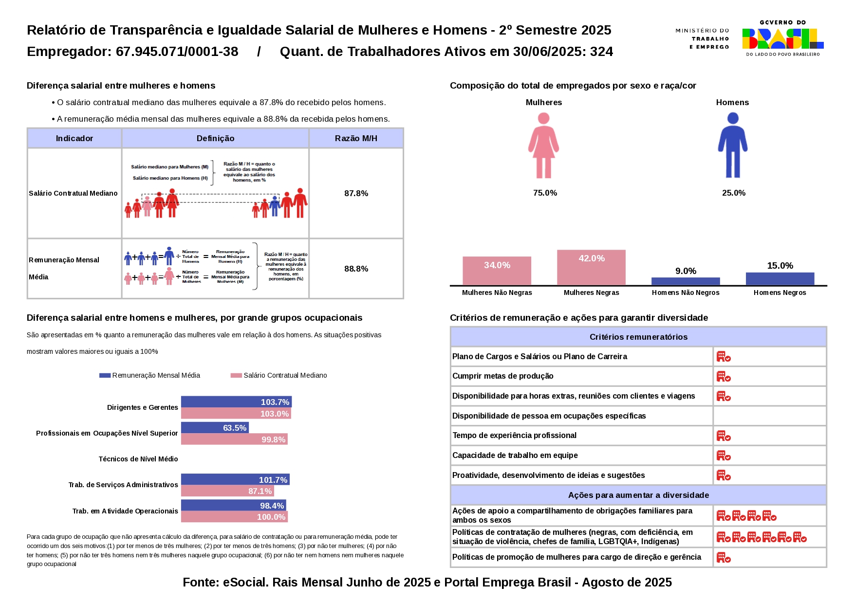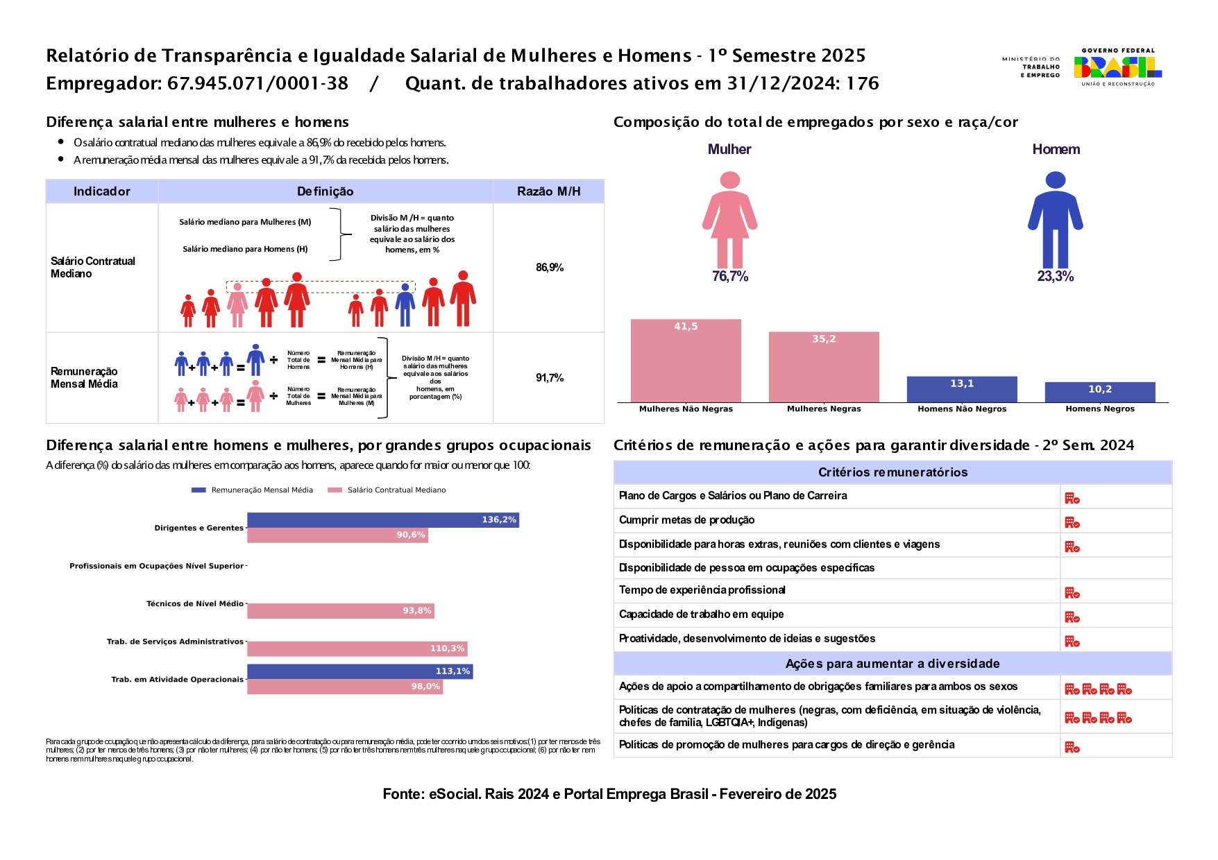 De acordo com as diretrizes estabelecidas pela Lei 14611/2023, apresentamos de forma clara e acessível os dados relativos aos salários e a diversidade dos nossos funcionários. Importante esclarecer que o desencontro remuneratório entre homens e mulheres é decorrente da área de atuação da empresa, fornecimento de refeição e facilities, a qual atraem em sua grande maioria o público de mulheres, seguindo o piso salarial da categoria. Essa divulgação não apenas atende às obrigações legais, mas também reforça o nosso compromisso com os mais altos padrões de integridade e responsabilidade corporativa.
